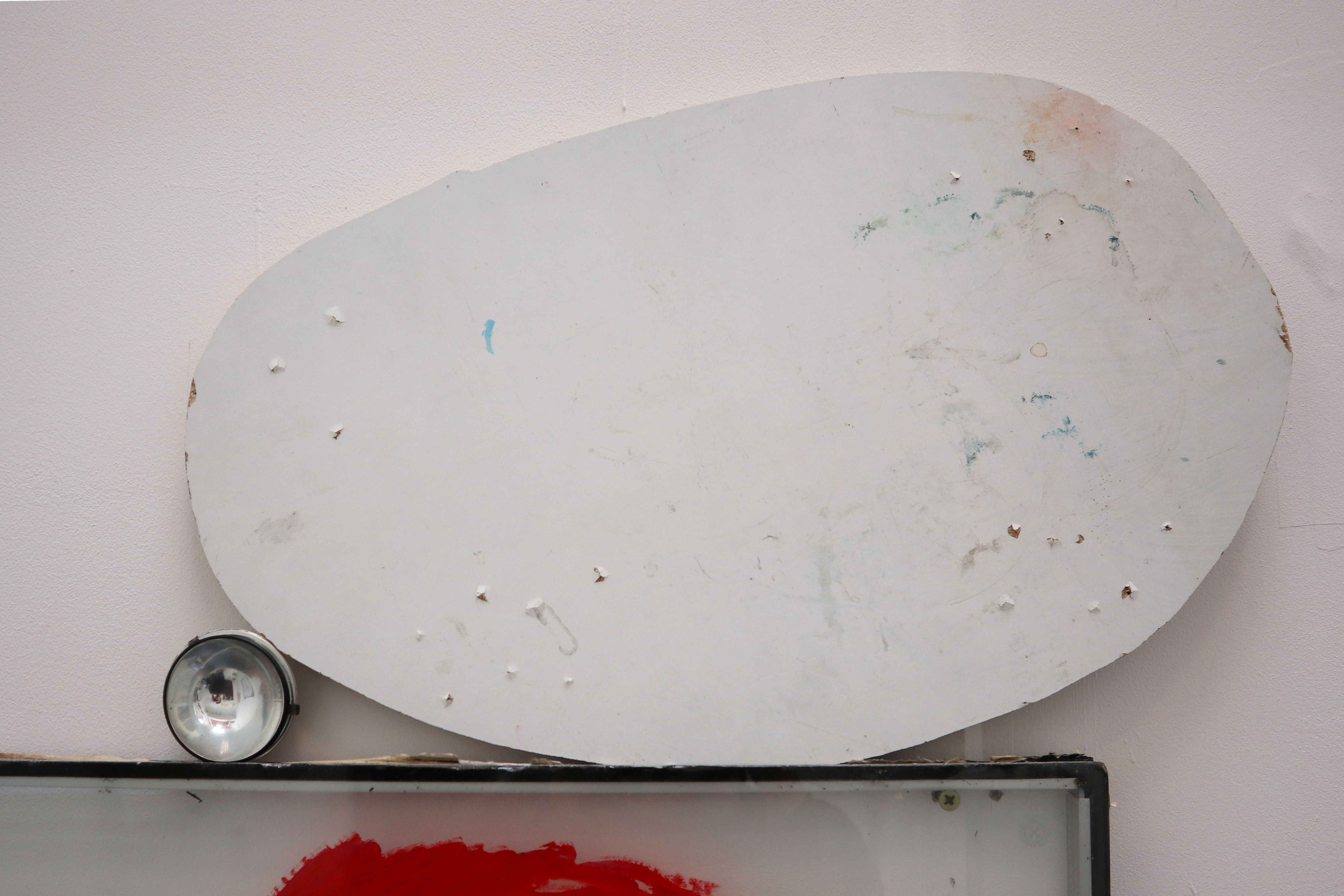 The work and painting is made in response to the serendipity of the found window using it to dictate the boundaries of the painting. This work includes a cut IKEA unit and a reflective element made from the combination of a concave mirror and convex lens, this reflections function is to remind the viewer that they exist and consequently of their place in the room while viewing the work, I thought that seeing the reflection of the room and themselfs in it while looking at the work would act to force the viewer to recognize that they exist, not only as the center of its own being gazing outward, but also as a mere object in the world of others.