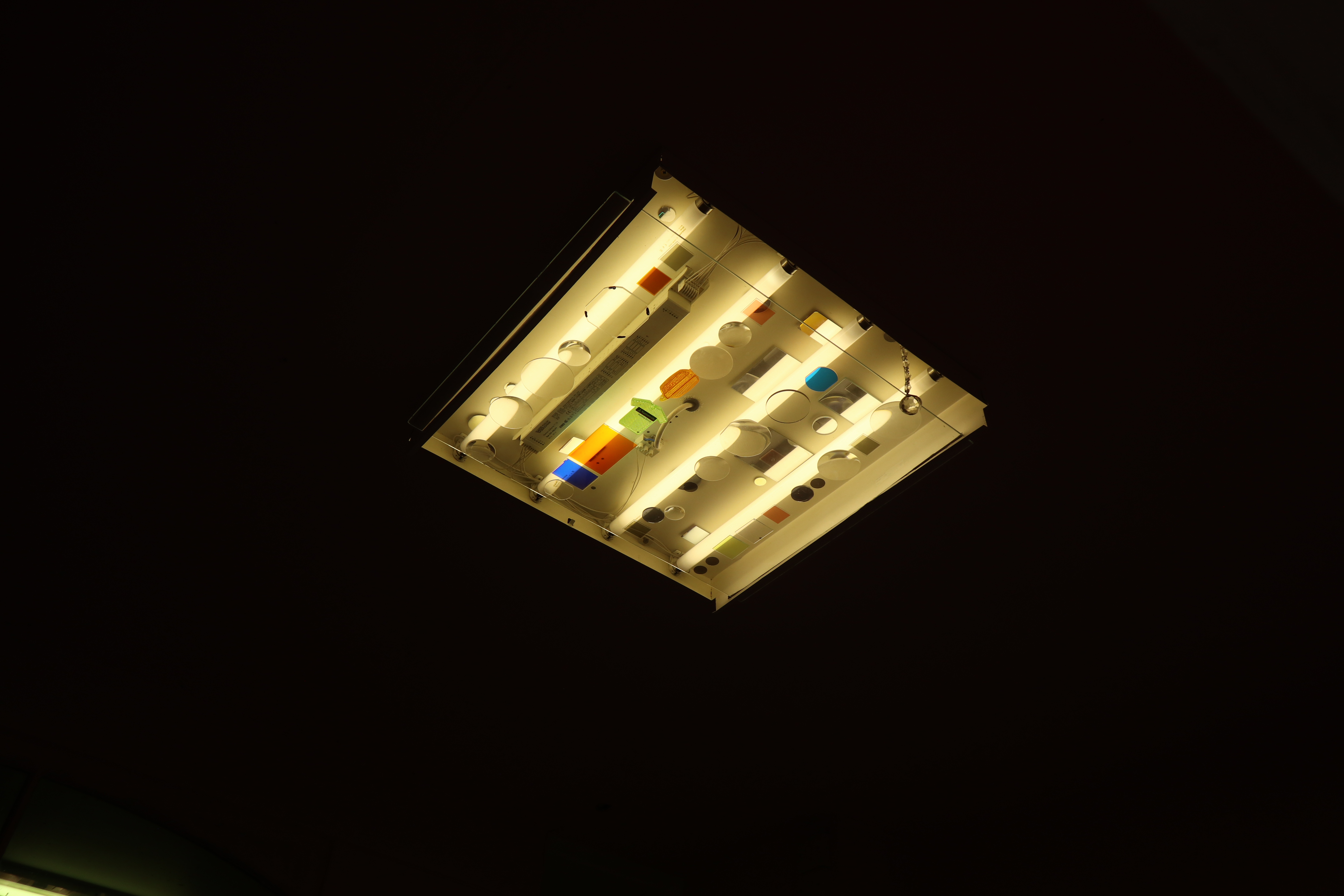 I found an old slide projector on the street and became interested in how the light passes though the lens, this led to me collecting other lenses, reflective objects and digital projector parts from markets until I found the fluorescent strip light unit and built/assembled this work. This work functions as a working light.