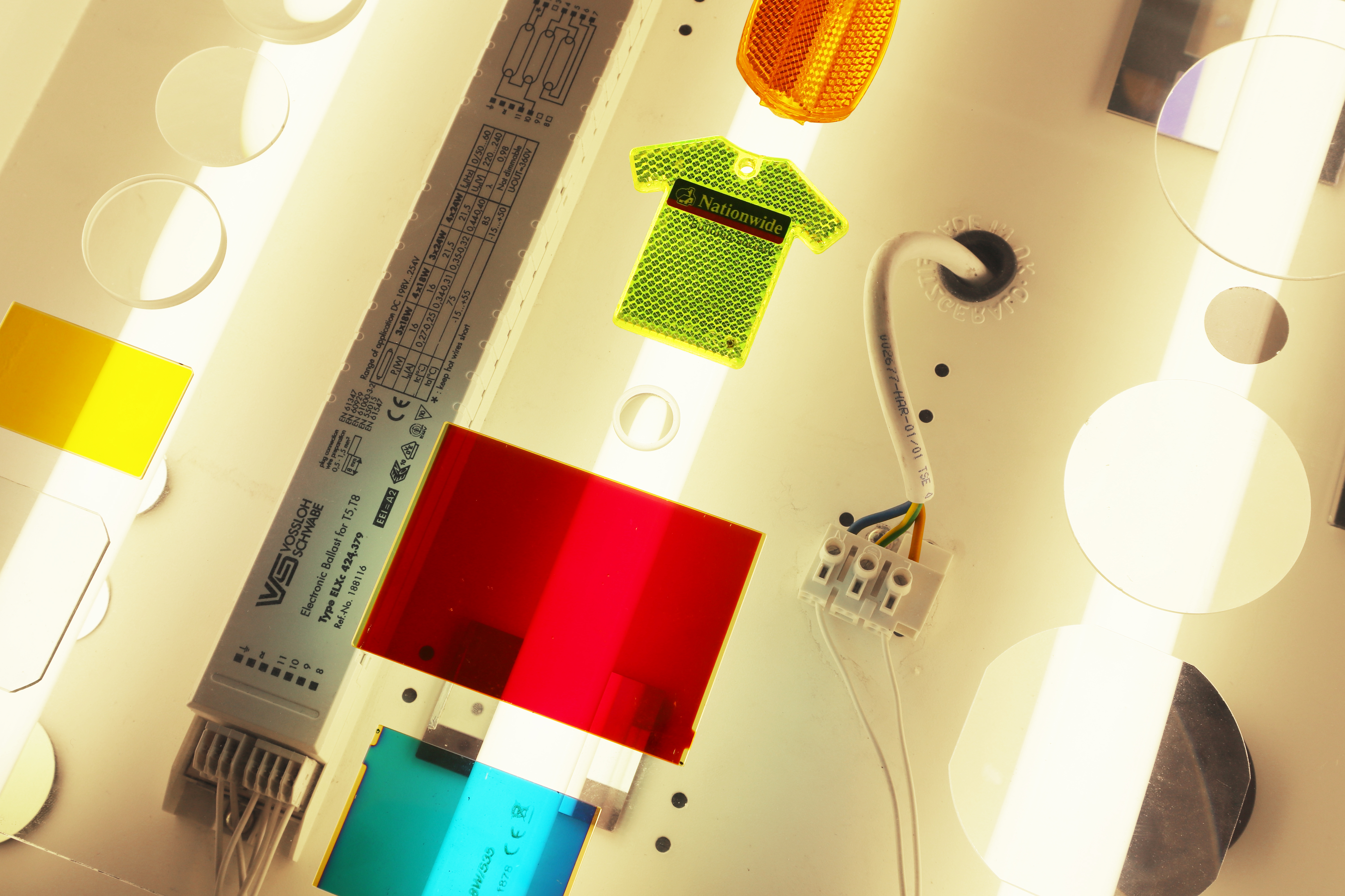 Found fluorescent strip light unit, spray paint, pane of glass, recycled projector lens’, lens’ from slide projector, lens’ from camera, lens’ from microscope, bike reflectors, Natwest reflector keyring, various mirrors, plastic crystal charm