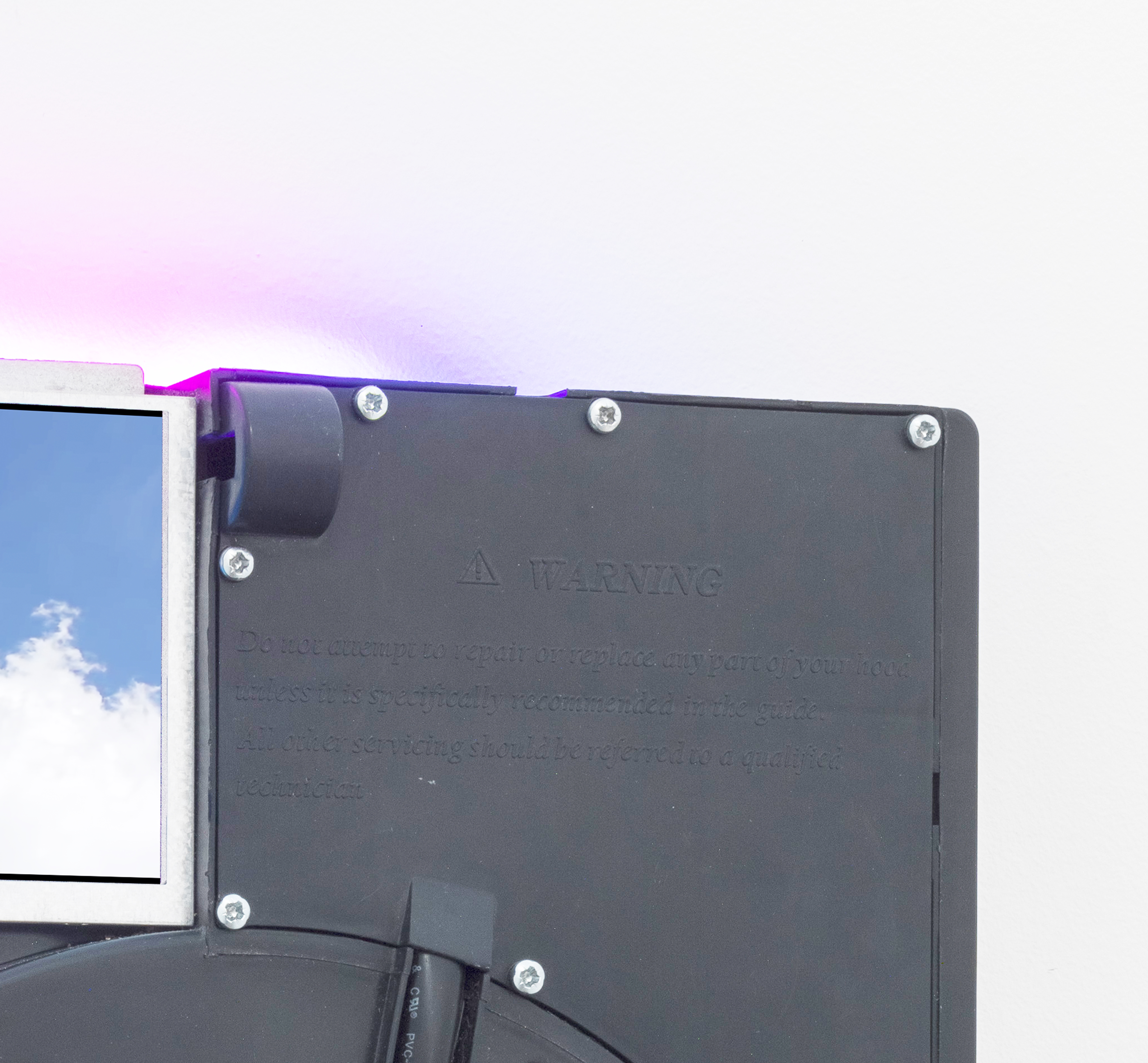 Raspberry Pi, 7” HD LED screen, various cables, kitchen extractor fan, washers, video loop (23:43), mdf, painted wooden beads, LED grow lights